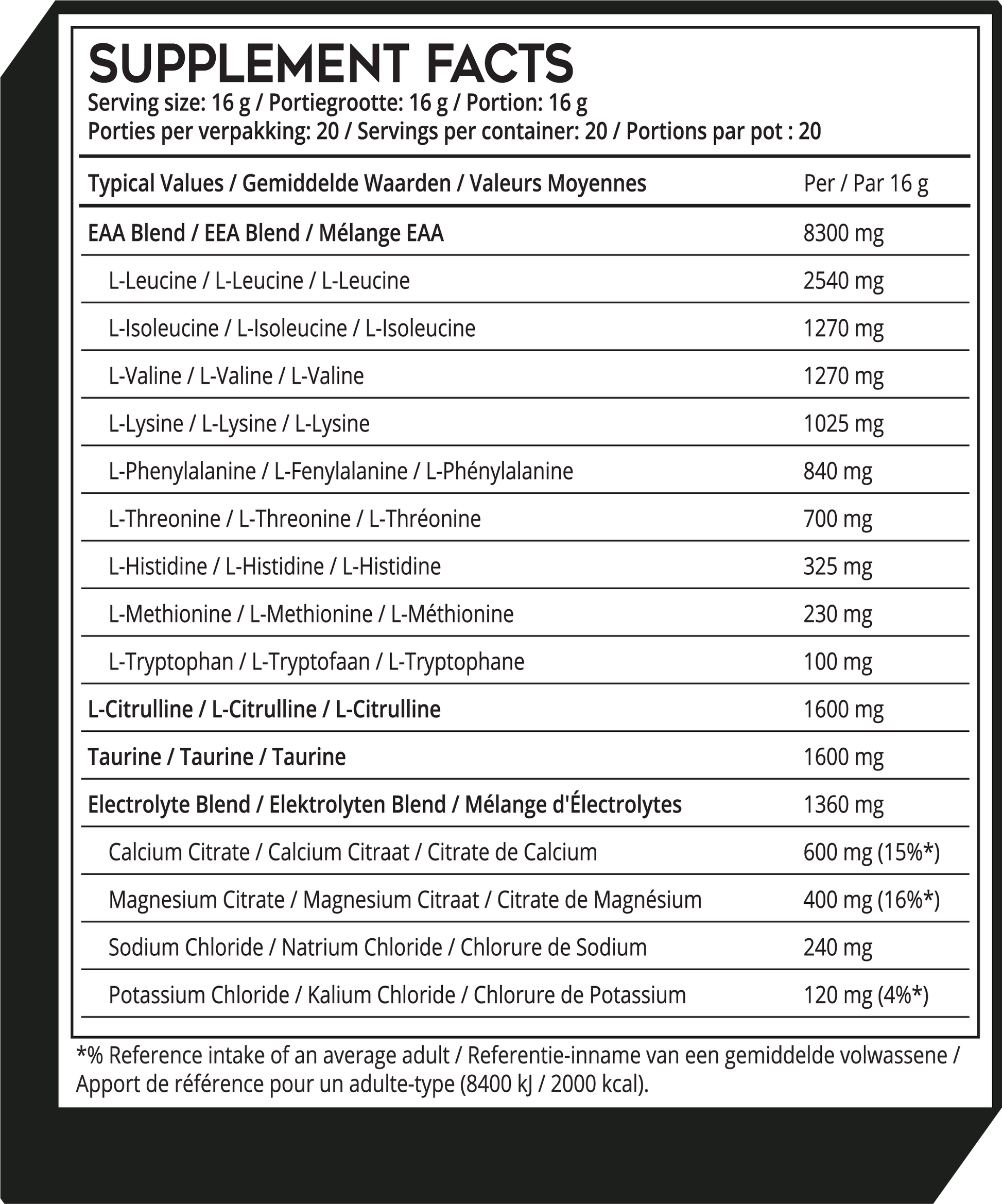 Veel EAA-producten bevatten slechts een gedeeltelijk aminozuurprofiel, maar Supspace EAA Aminos bevat echt alle 9 essentiële aminozuren. Dit maakt het een complete keuze voor iedereen die serieus bezig is met voeding en training. Daarnaast bevat deze formule ook nog eens elektrolyten, L-citrulline en taurine om het een complete sportdrank te maken.
